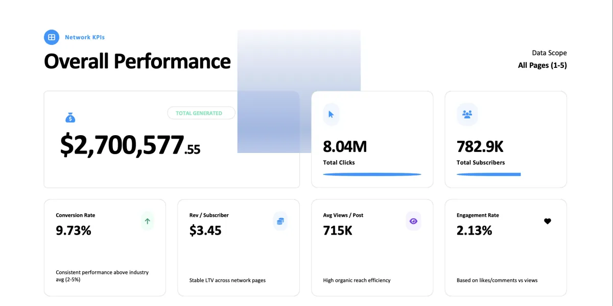 Gain access to premium promotional pages with a combined reach of ~1 billion followers across 2,700+ accounts, all with audiences historically proven to convert and spend on creators.